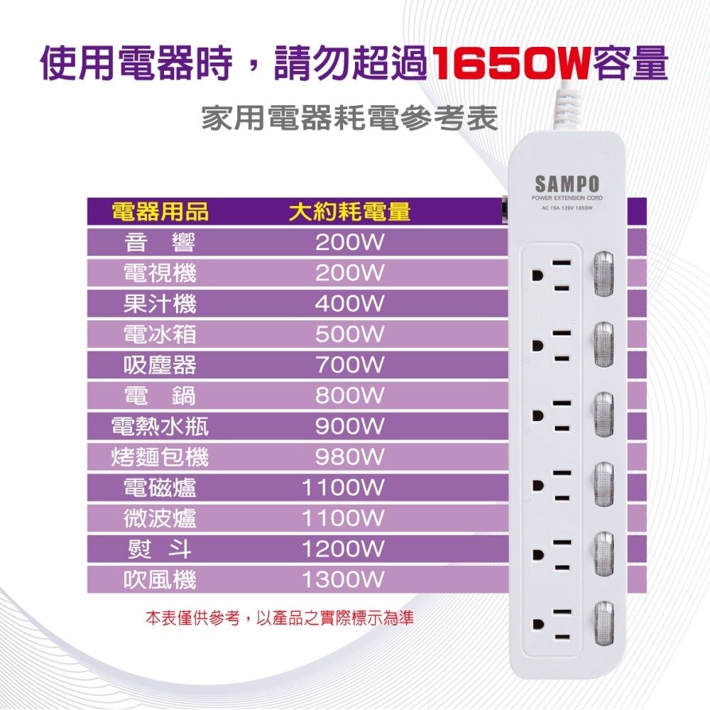 EL-W66R6 SAMPO六開六插電源延長線6尺 (2)