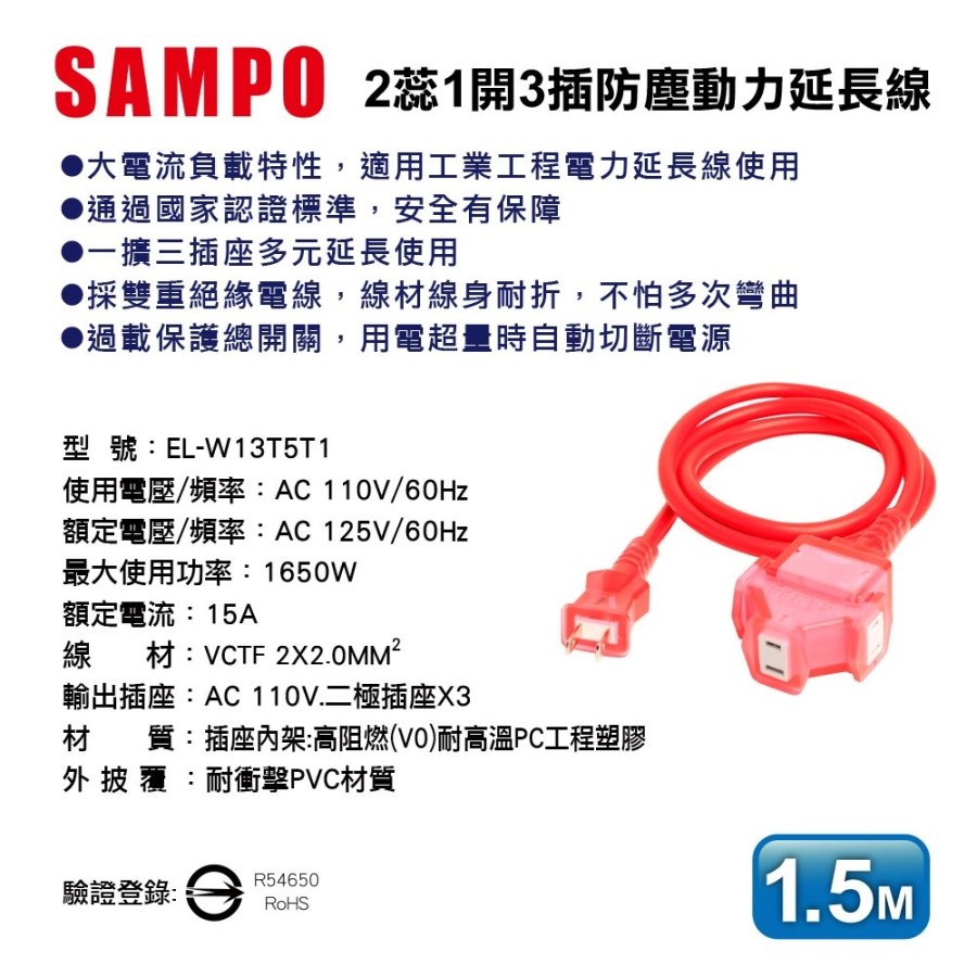 EL-W13T5T1 聲寶一開三插防塵動力延長線-1 (6)