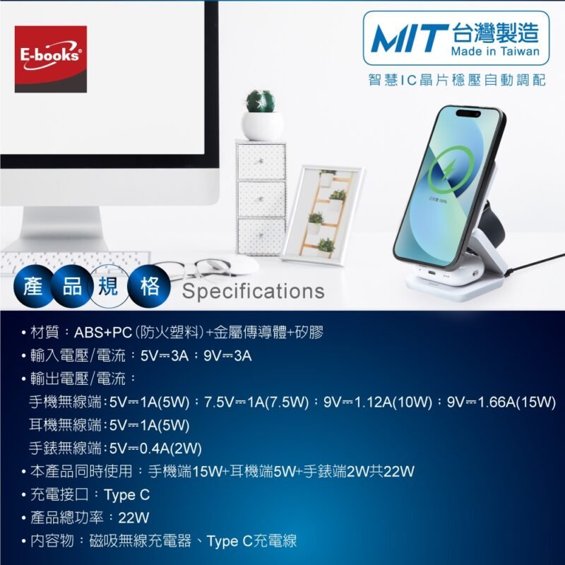 ⭐️E-books 22W三合一支架摺疊磁吸快充無線充電器B98(台灣製造)
