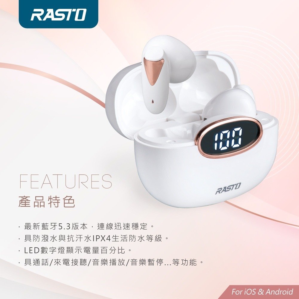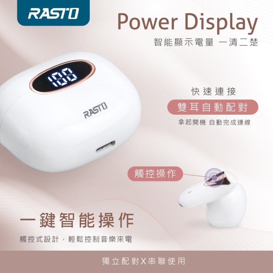 ⭐️RASTO純白晶石電量顯示真無線藍牙5.3耳機 RS46